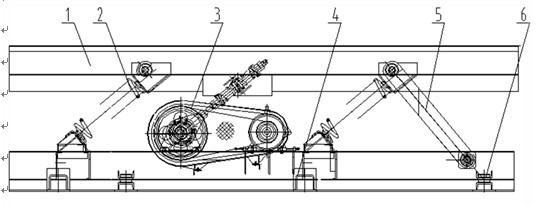 1輸送槽、2主振彈簧、3驅(qū)動連桿機(jī)構(gòu)、4底座、5導(dǎo)向桿、6輔助支座。
